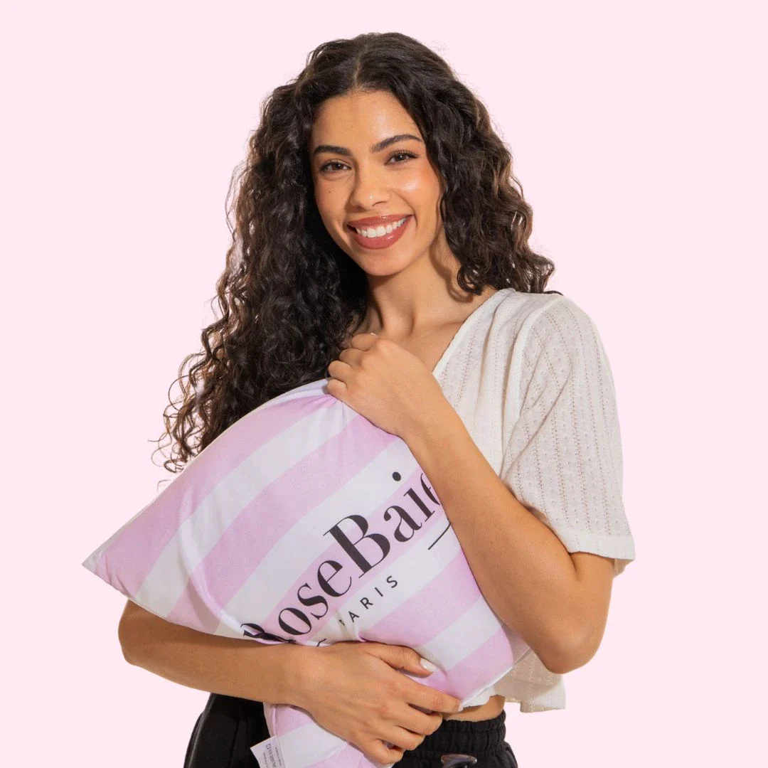 Apportez une touche douce et féminine à votre espace avec le coussin signature Rosebaie. Son design rayé rose pâle et blanc, associé au logo noir au centre, en fait l’accessoire déco idéal pour sublimer votre coin beauté, lit ou canapé.